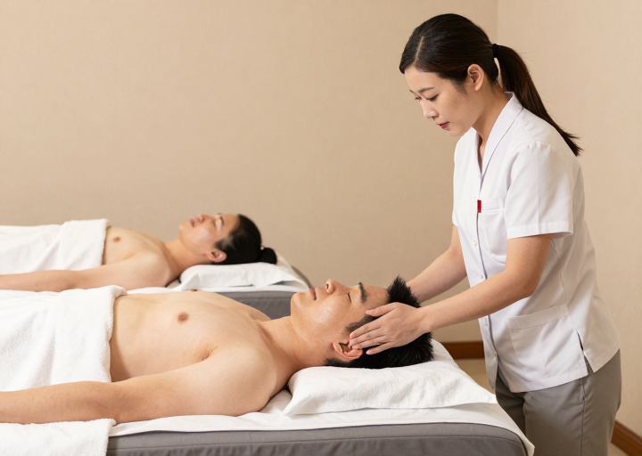 经络导引:出浴后,躺于专业按摩床。技师以通透的精油,运用揉、推、点、按等手法,沿经络走向进行导引,深化药效,缓解深层肌肉酸痛与关节僵硬。